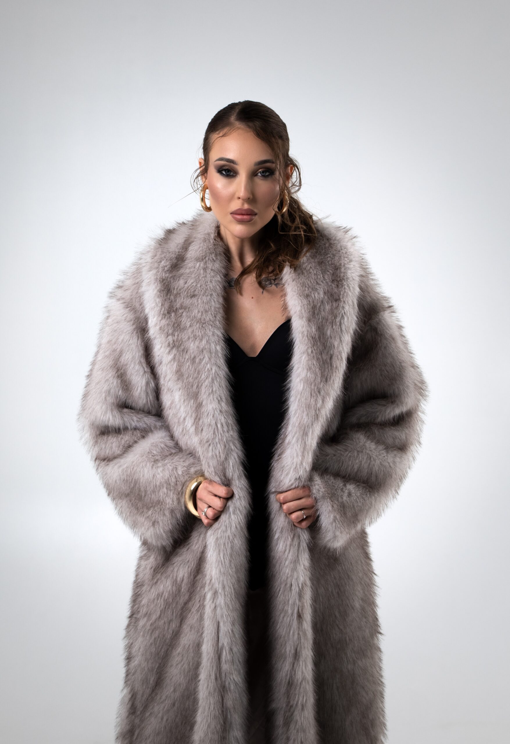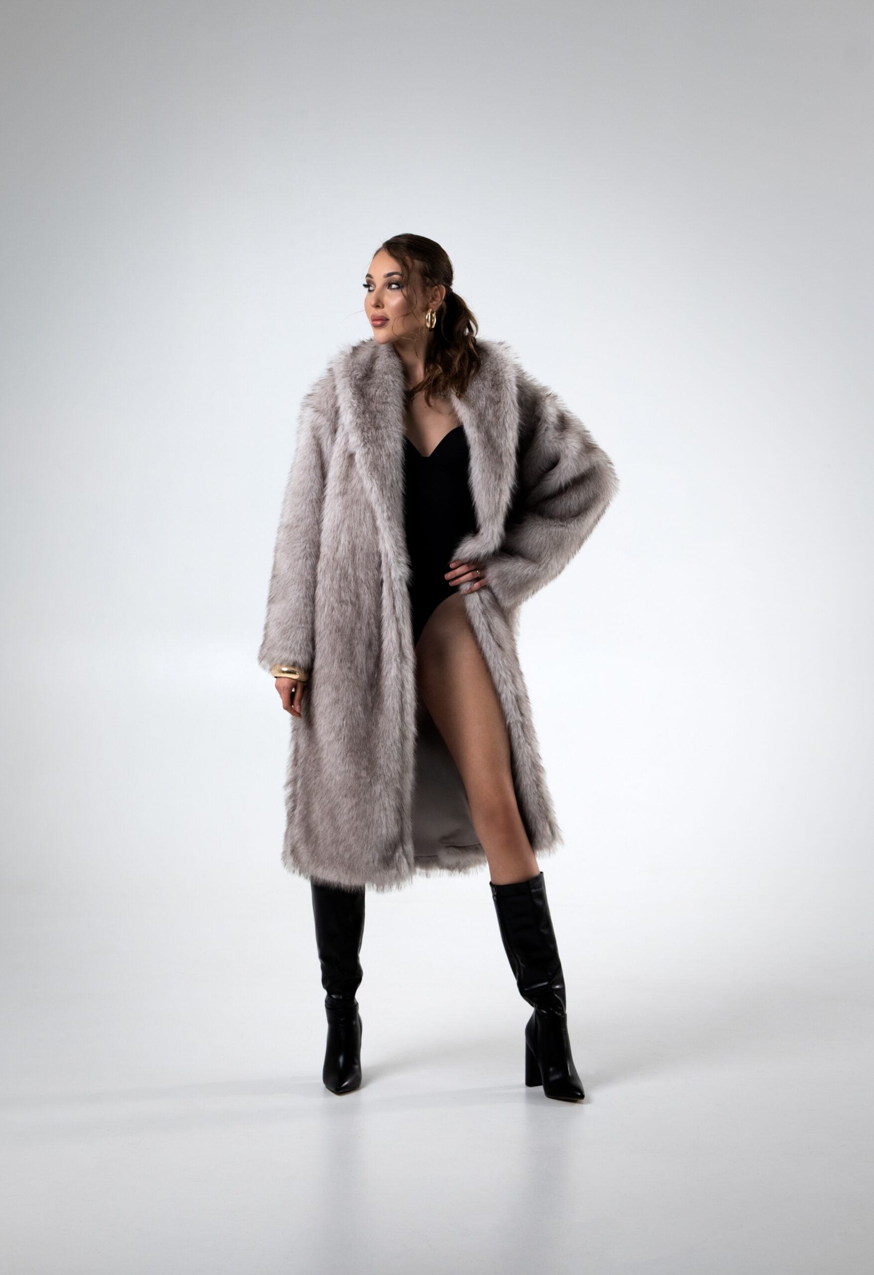 Prabangus ir drąsus įvaizdis, kuriame kailiniai tampa ryškiausiu akcentu. Elegantiškas derinys sukuria įspūdingą moteriškumo ir pasitikėjimo savimi atmosferą – stilius, skirtas toms, kurios nevengia išsiskirti.
